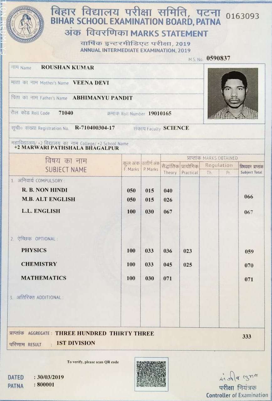 | Exam | Full Marks | Pass Marks | Marks Obtained |