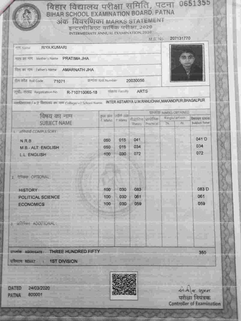 | Grade : A+ | Percentage : 85.50 % | MS. No. : 19712 | Date of Issue : 21-Mar-2022 |