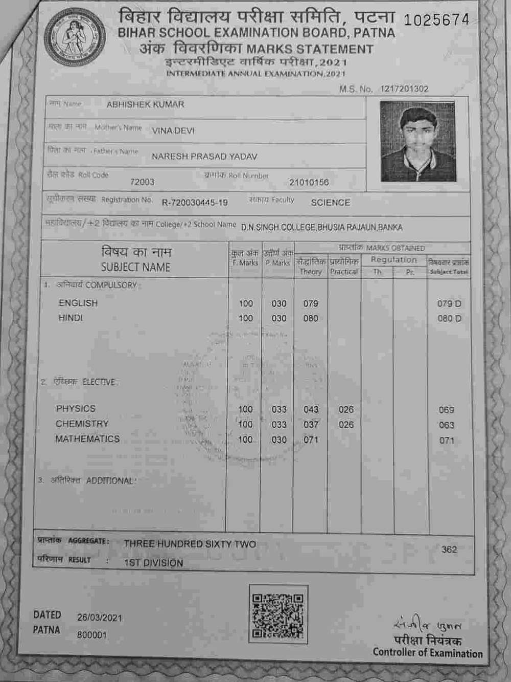 | Exam | Full Marks | Pass Marks | Marks Obtained |