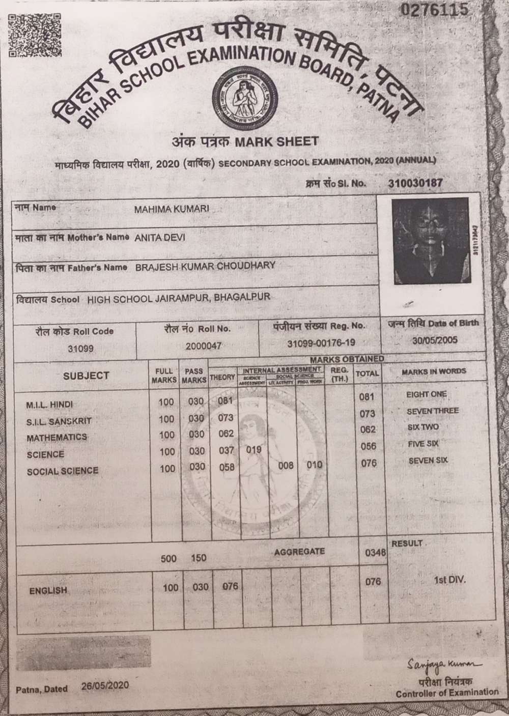 | Grade : A | Percentage : 82.50 % | MS. No. : 20854 | Date of Issue : 20-Sep-2022 |