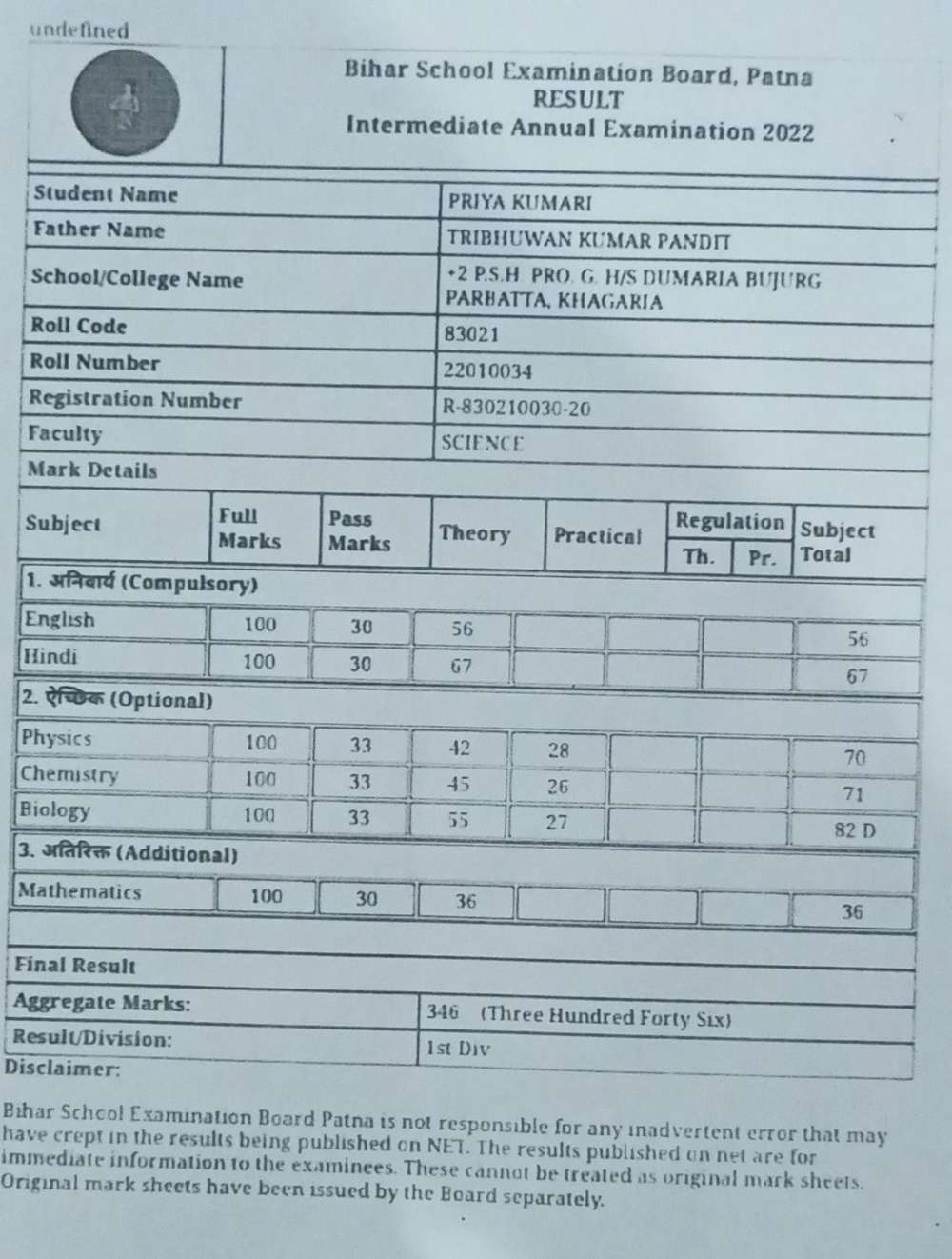 | Exam | Full Marks | Pass Marks | Marks Obtained |