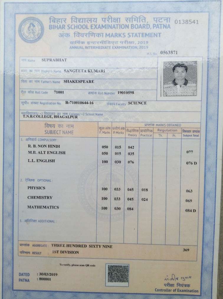 | Exam | Full Marks | Pass Marks | Marks Obtained |