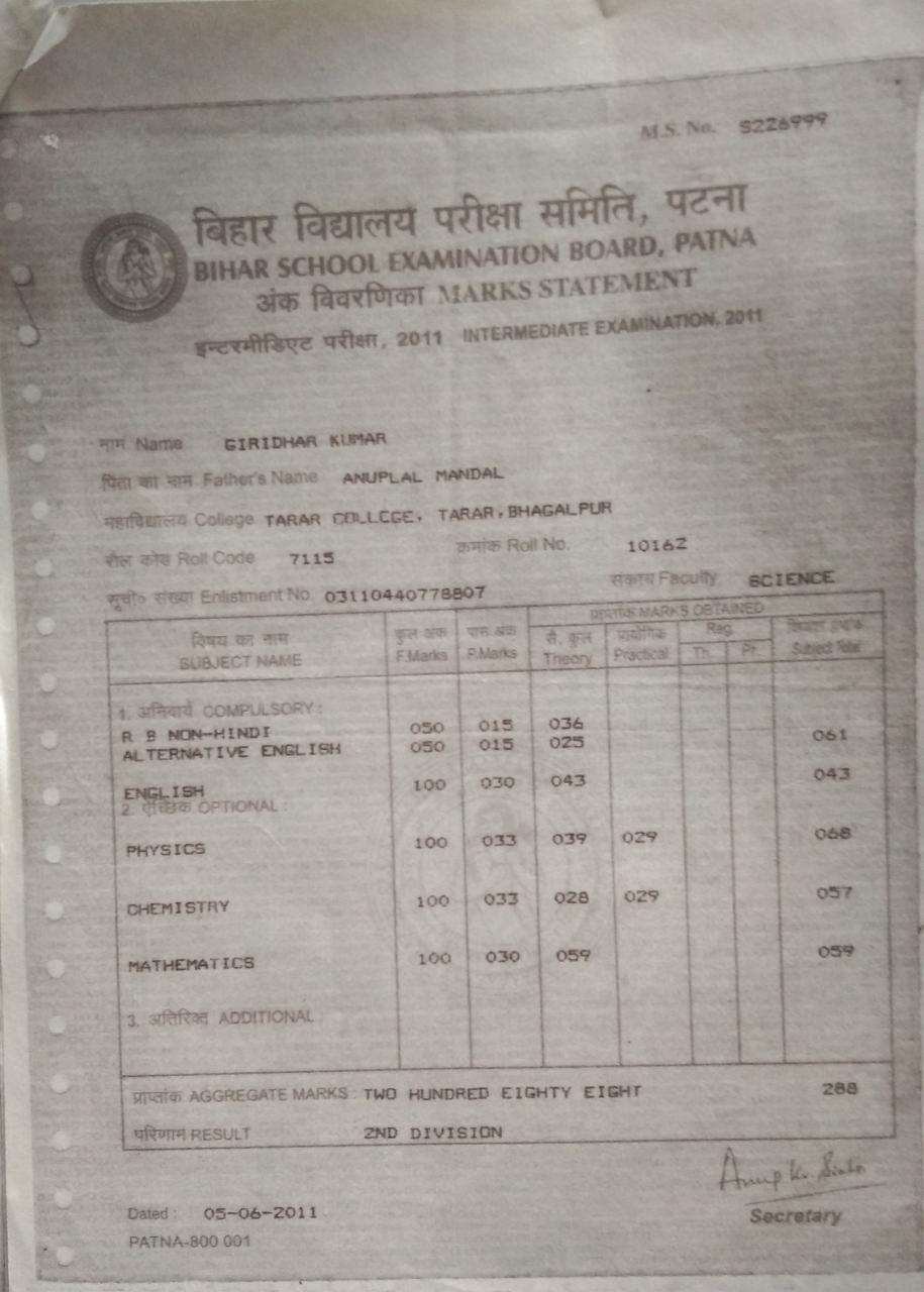 | Exam | Full Marks | Pass Marks | Marks Obtained |