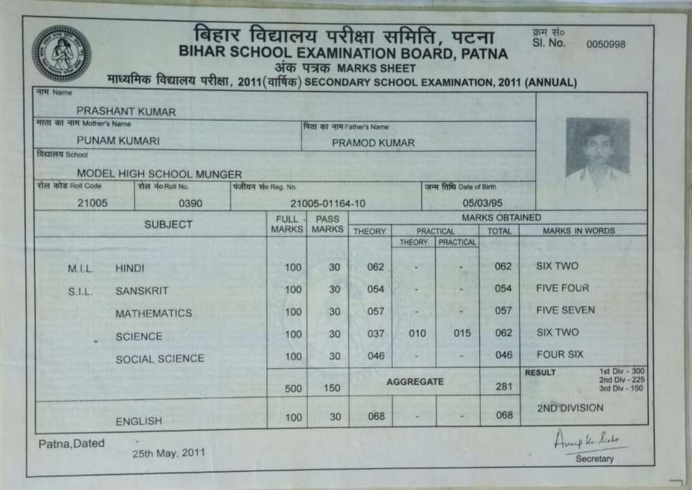 | Exam | Full Marks | Pass Marks | Marks Obtained |