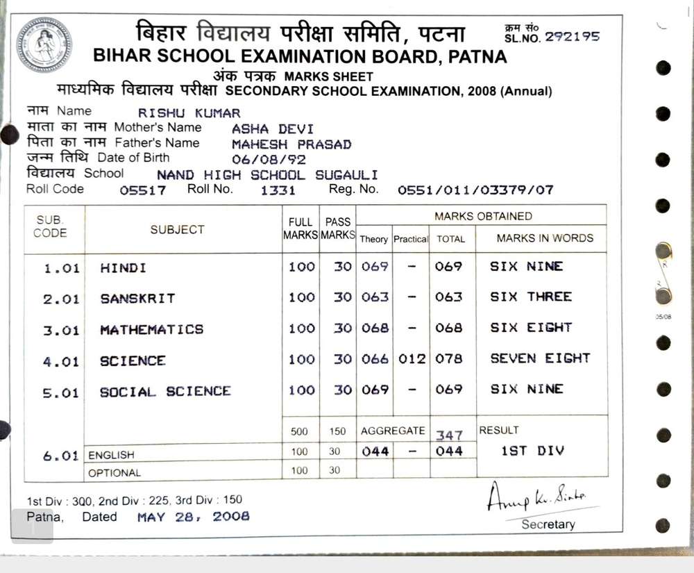 | Exam | Full Marks | Pass Marks | Marks Obtained |