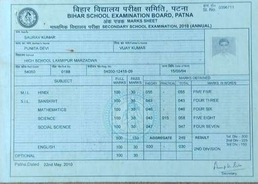 | Exam | Full Marks | Pass Marks | Marks Obtained |