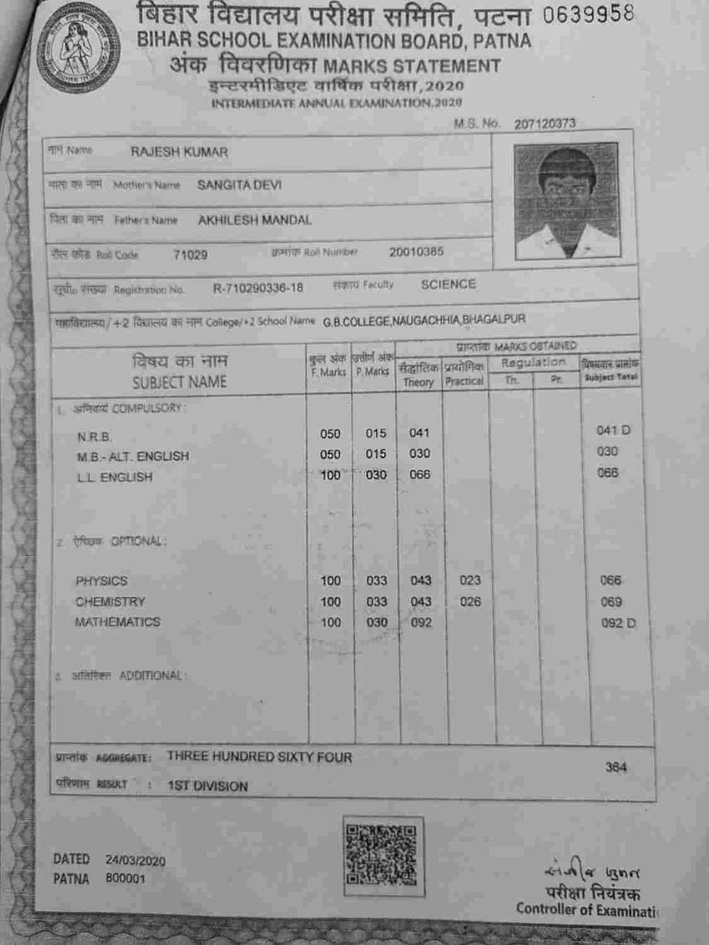 | Exam | Full Marks | Pass Marks | Marks Obtained |