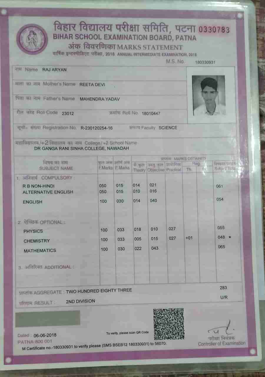 | Exam | Full Marks | Pass Marks | Marks Obtained |