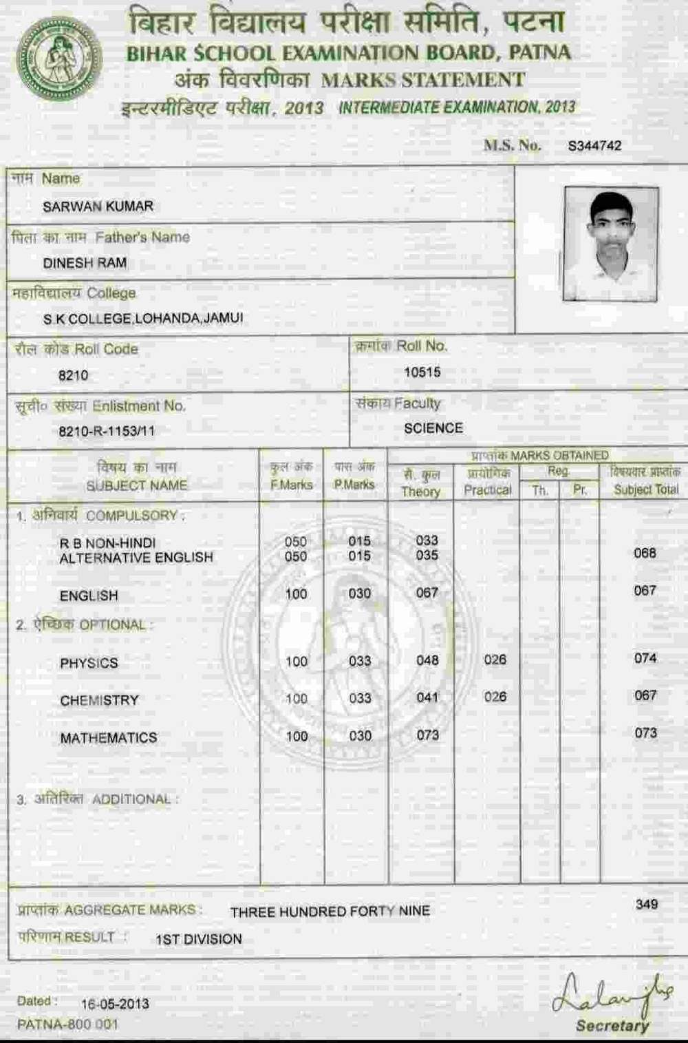 | Exam | Full Marks | Pass Marks | Marks Obtained |