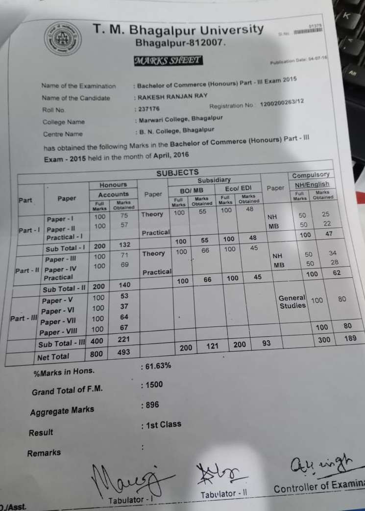 | Exam | Full Marks | Pass Marks | Marks Obtained |