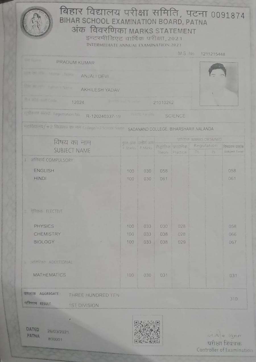 | Exam | Full Marks | Pass Marks | Marks Obtained |