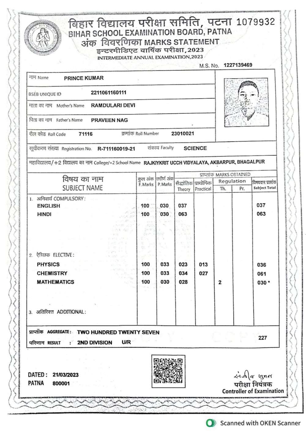 | Exam | Full Marks | Pass Marks | Marks Obtained |
