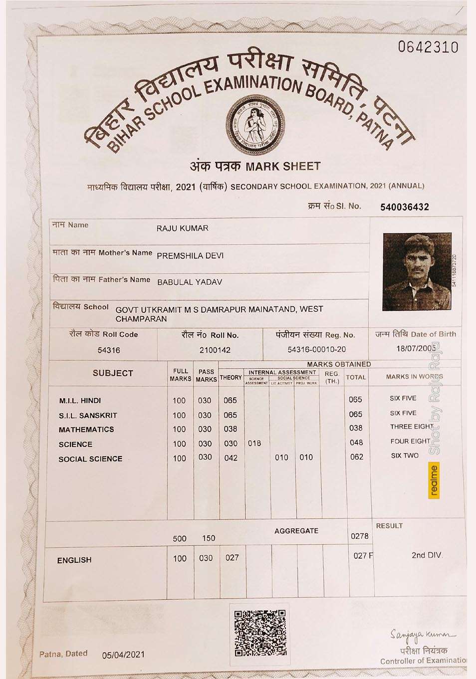 | Exam | Full Marks | Pass Marks | Marks Obtained |