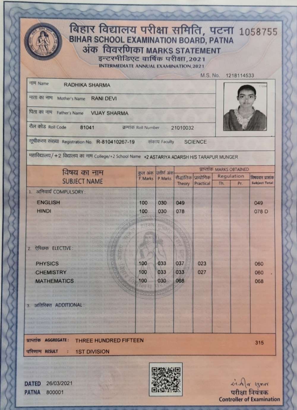 | Grade : A | Percentage : 75.00 % | MS. No. : 31756 | Date of Issue : 30-Aug-2023 |