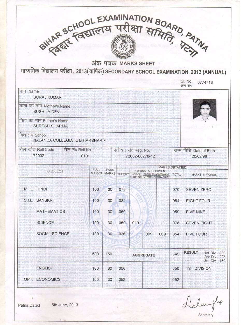 | Exam | Full Marks | Pass Marks | Marks Obtained |