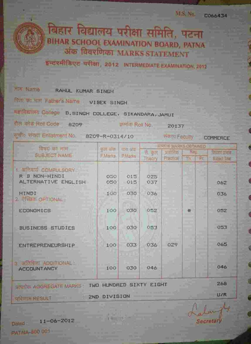 | Exam | Full Marks | Pass Marks | Marks Obtained |