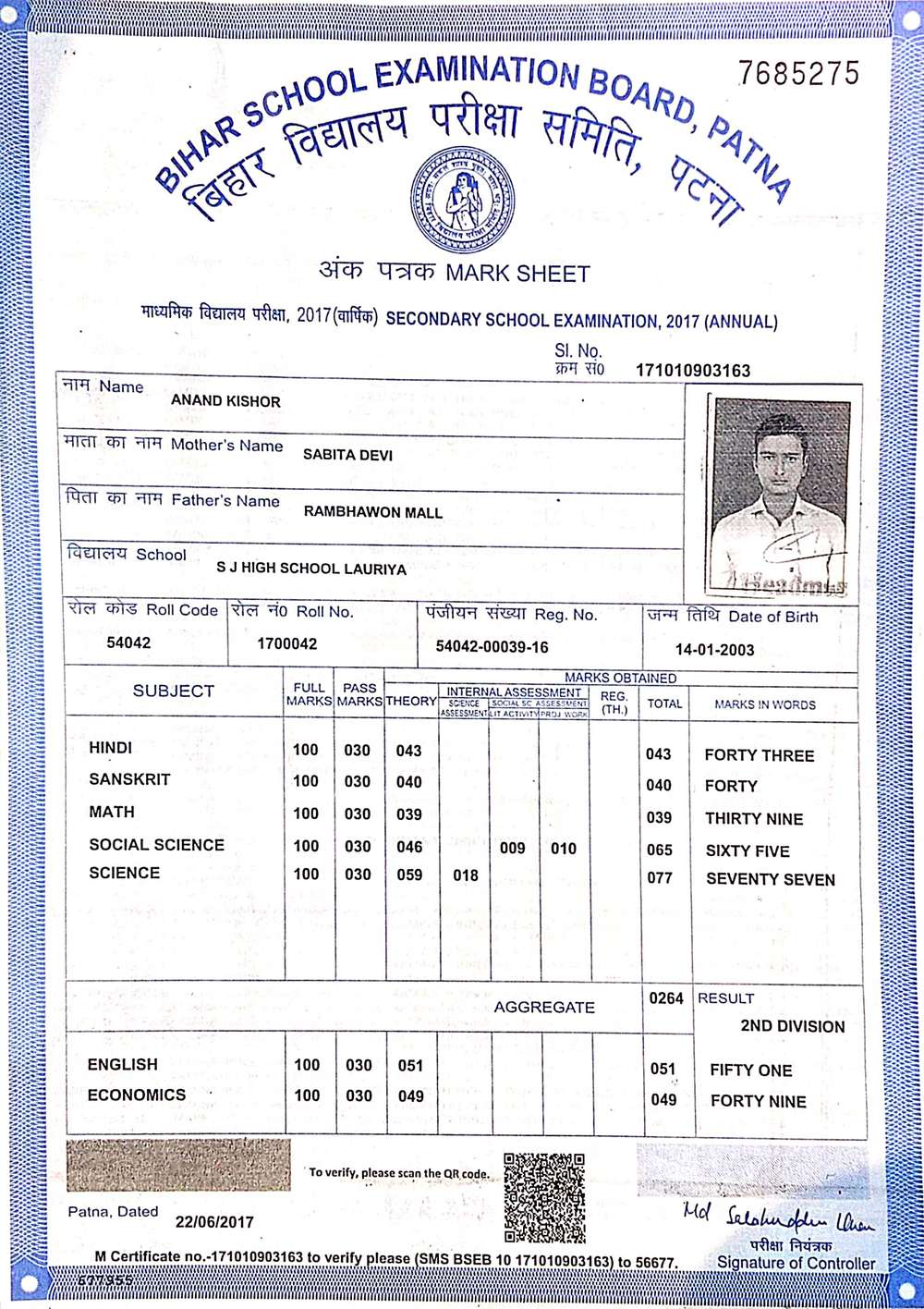 | Grade : A | Percentage : 82.75 % | MS. No. : 37564 | Date of Issue : 25-Jul-2024 |