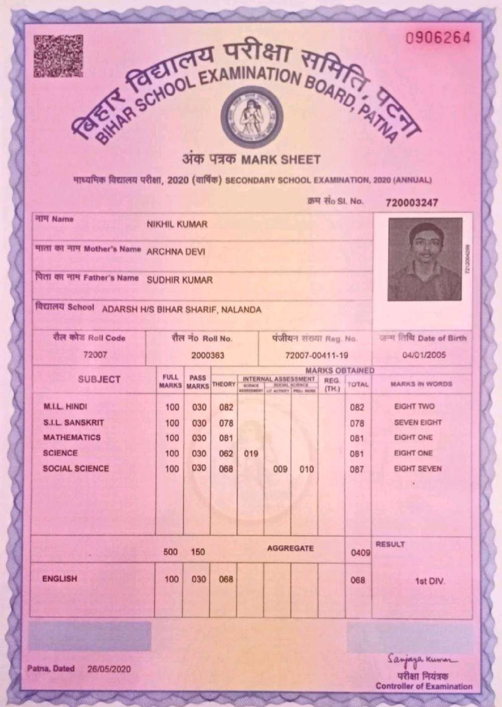 | Grade : A | Percentage : 84.00 % | MS. No. : 39856 | Date of Issue : 15-Sep-2025 |