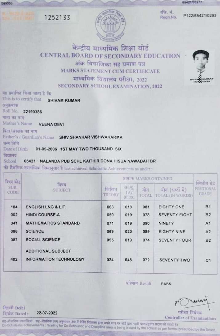 | Grade : B | Percentage : 40.00 % | MS. No. : 40129 | Date of Issue : 15-Sep-2025 |