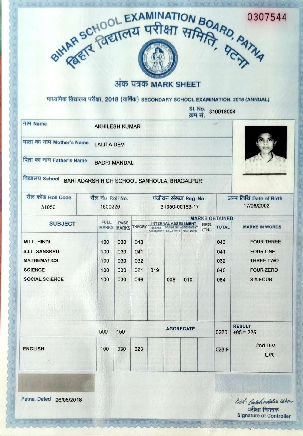 | Exam | Full Marks | Pass Marks | Marks Obtained |