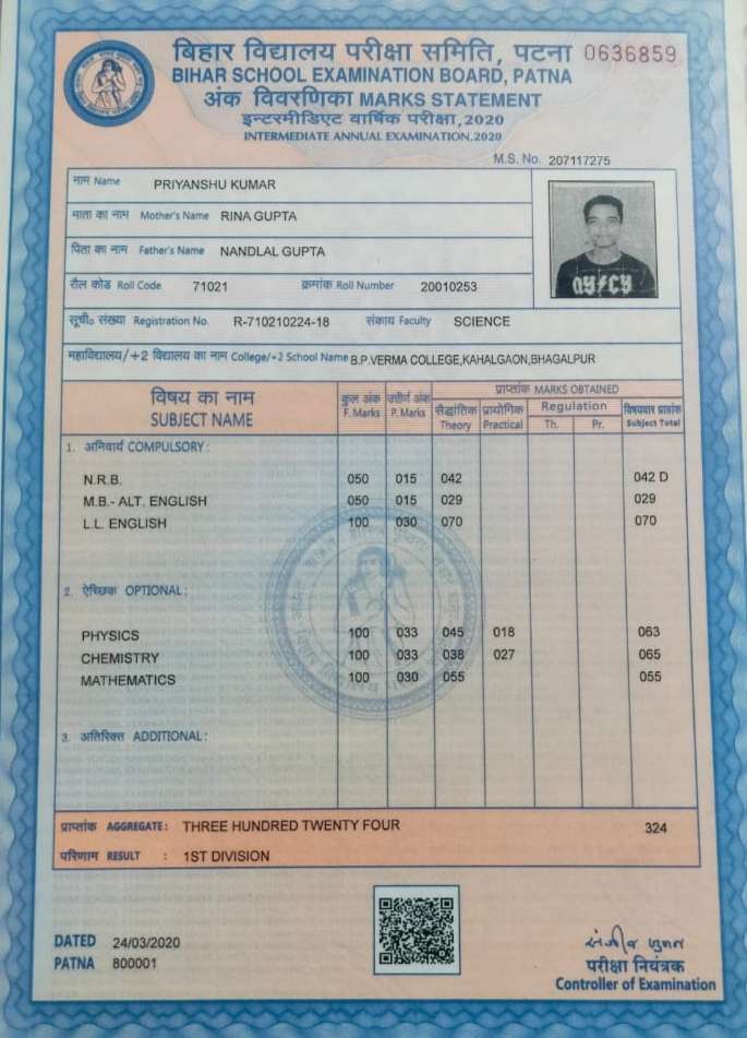 | Exam | Full Marks | Pass Marks | Marks Obtained |