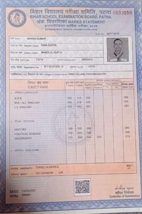 | Exam | Full Marks | Pass Marks | Marks Obtained |