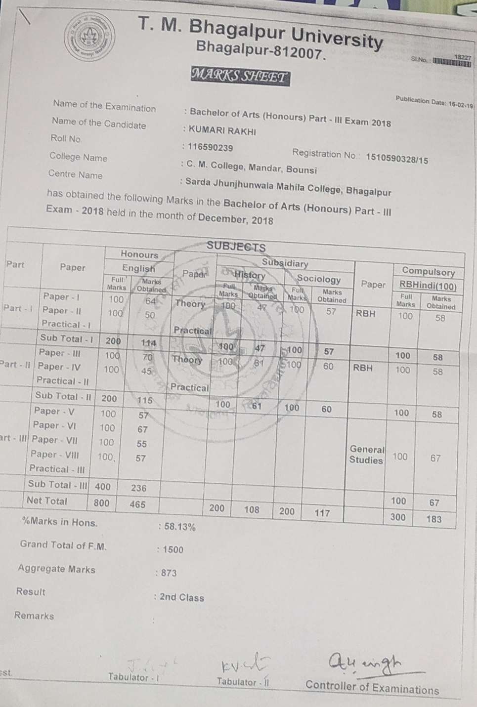 | Grade : A | Percentage : 83.25 % | MS. No. : 08018 | Date of Issue : 15-Feb-2021 |
