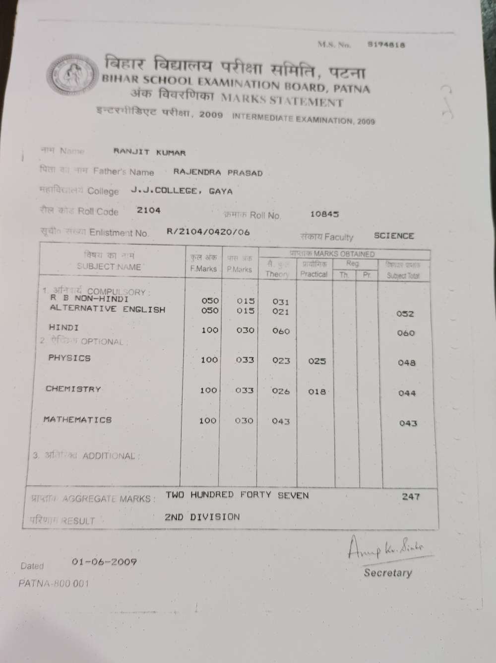 | Grade : A | Percentage : 84.25 % | MS. No. : A-21981 | Date of Issue : 20-Aug-2022 |
