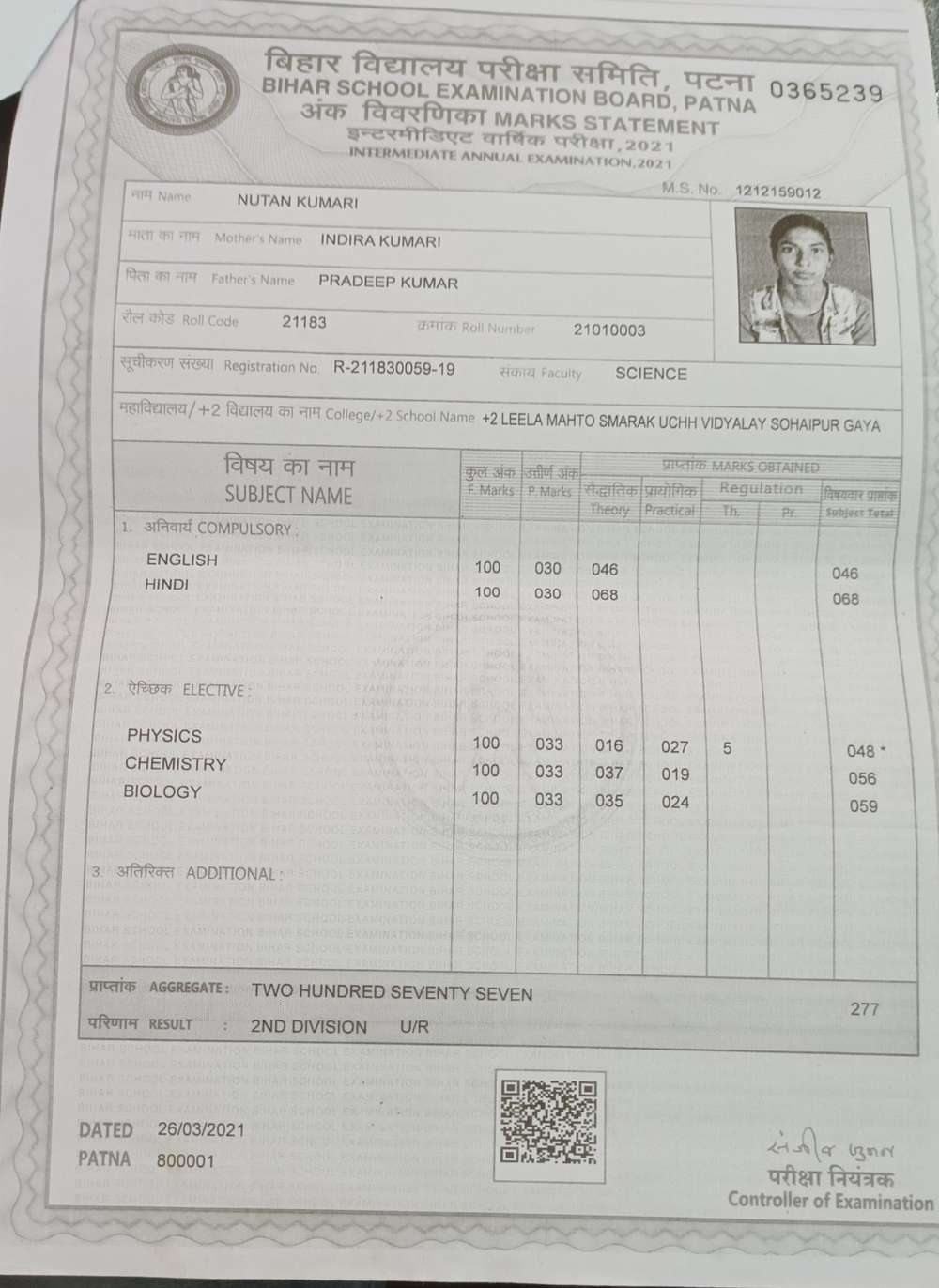 | Exam | Full Marks | Pass Marks | Marks Obtained |