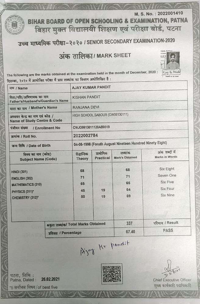 | Exam | Full Marks | Pass Marks | Marks Obtained |