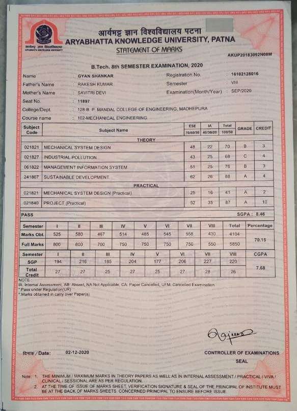 | Exam | Full Marks | Pass Marks | Marks Obtained |
