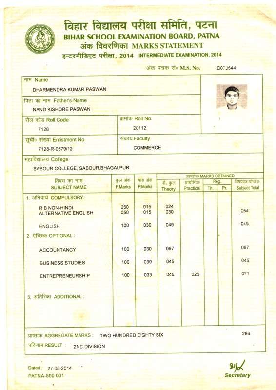 | Exam | Full Marks | Pass Marks | Marks Obtained |