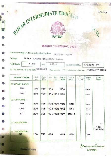 | Exam | Full Marks | Pass Marks | Marks Obtained |