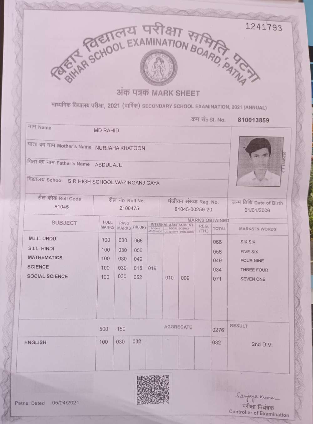 | Exam | Full Marks | Pass Marks | Marks Obtained |