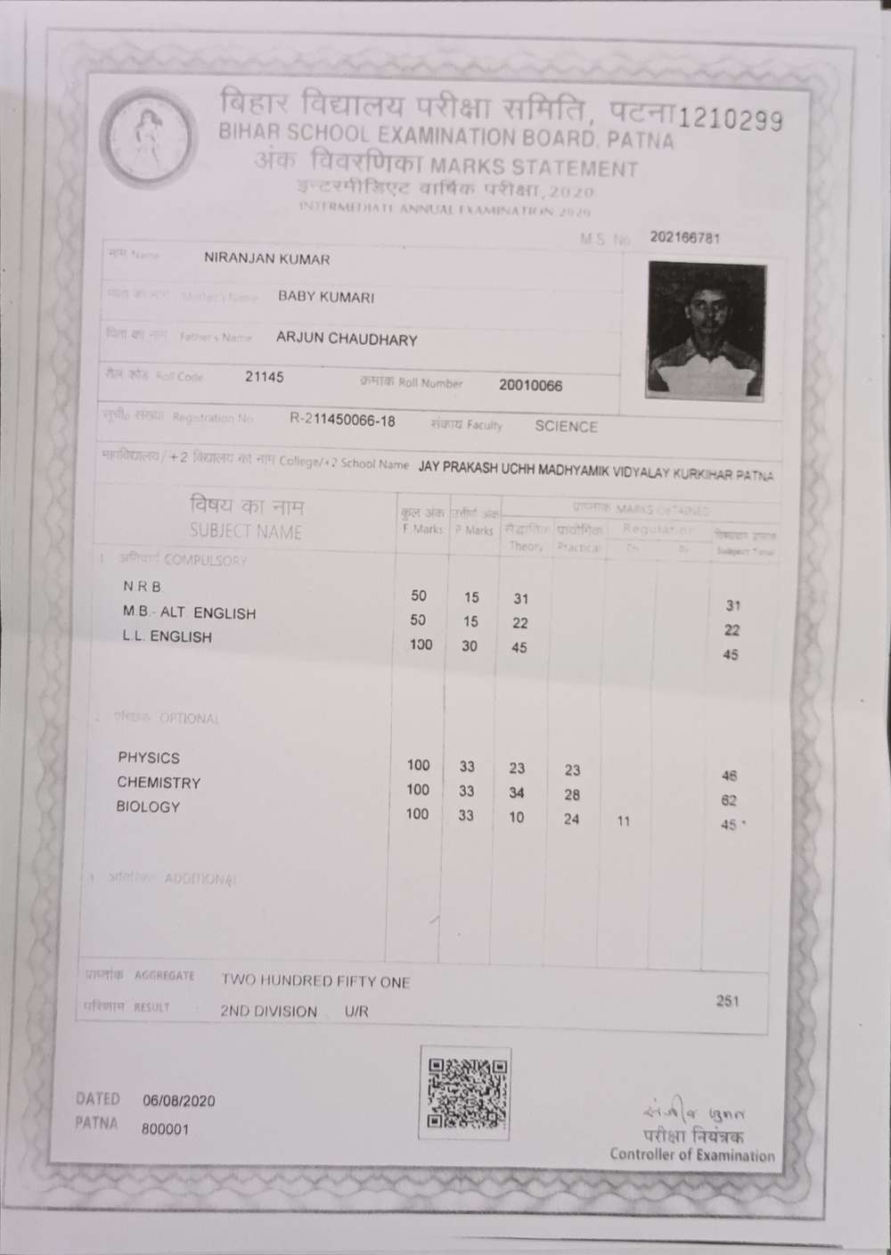 | Exam | Full Marks | Pass Marks | Marks Obtained |