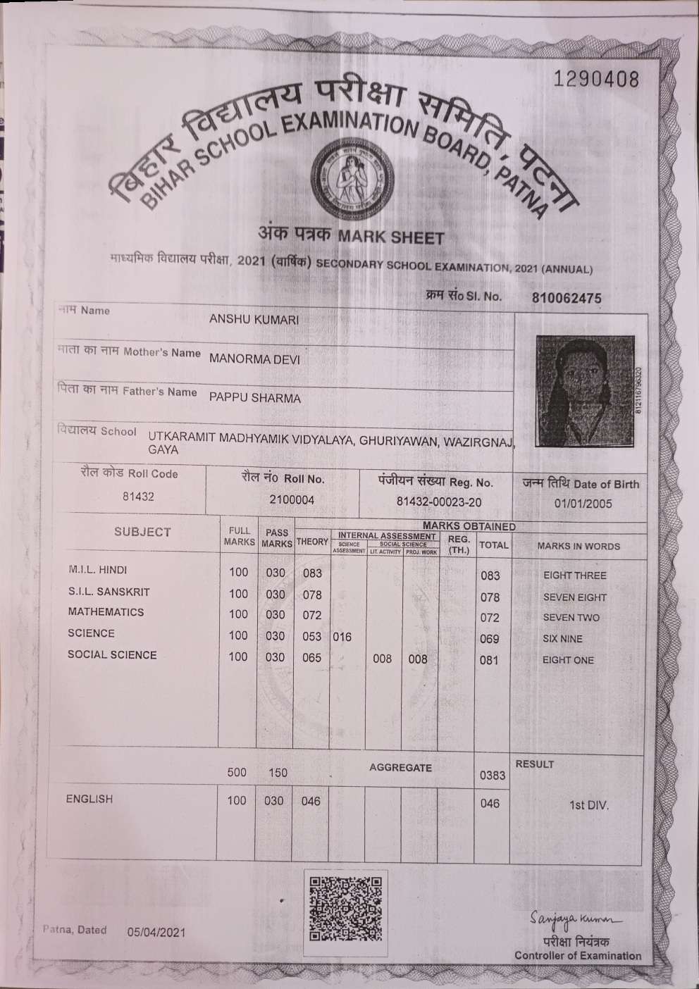 | Grade : A+ | Percentage : 85.50 % | MS. No. : 36263 | Date of Issue : 20-Dec-2023 |