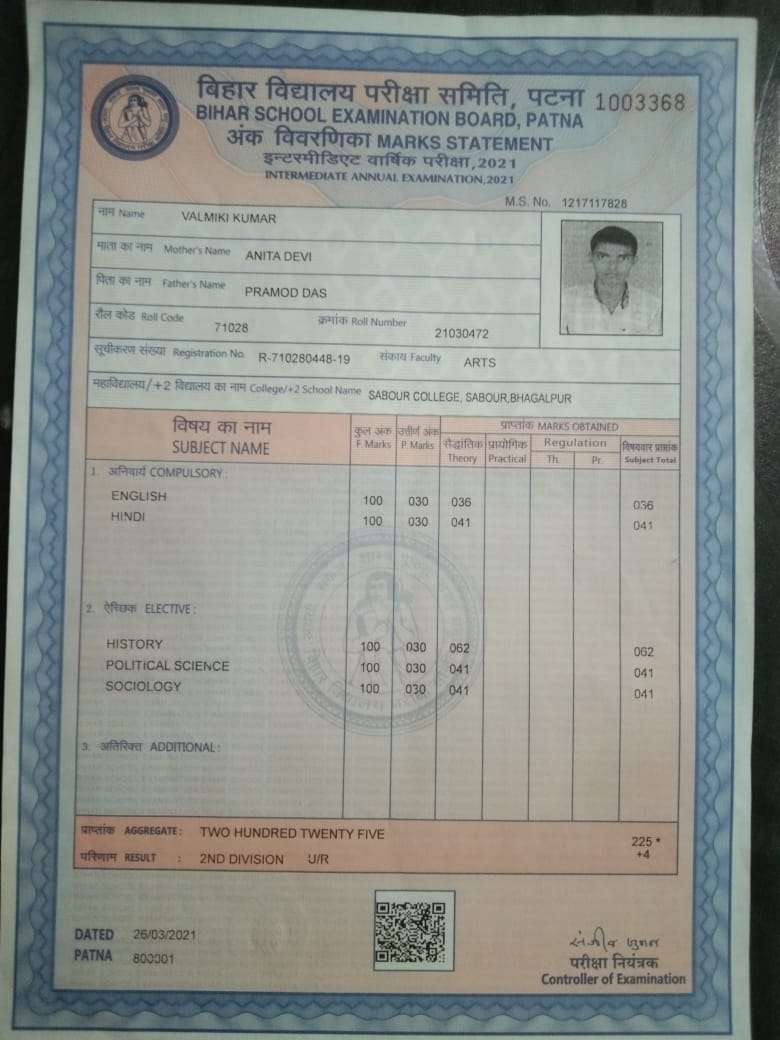 | Exam | Full Marks | Pass Marks | Marks Obtained |