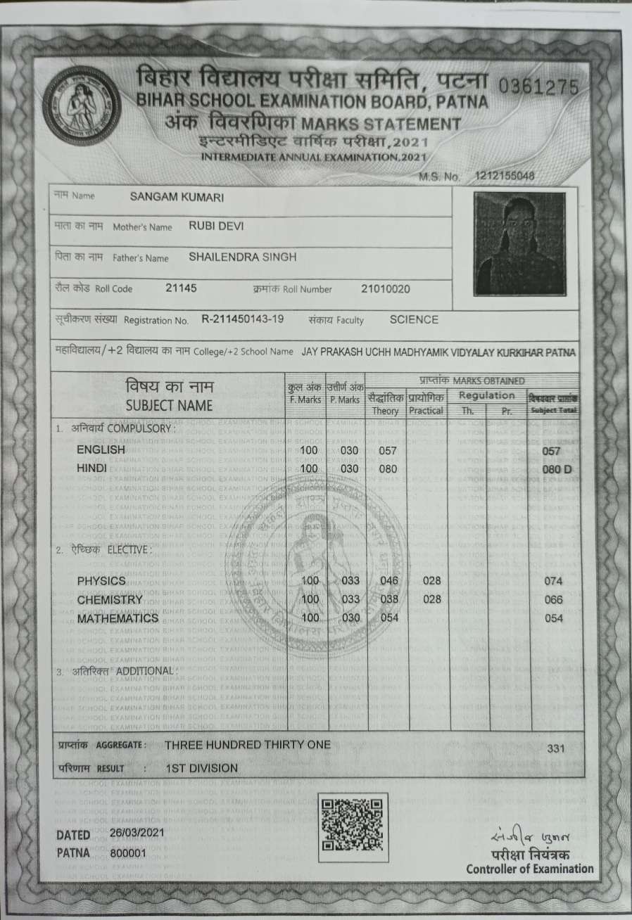 | Exam | Full Marks | Pass Marks | Marks Obtained |