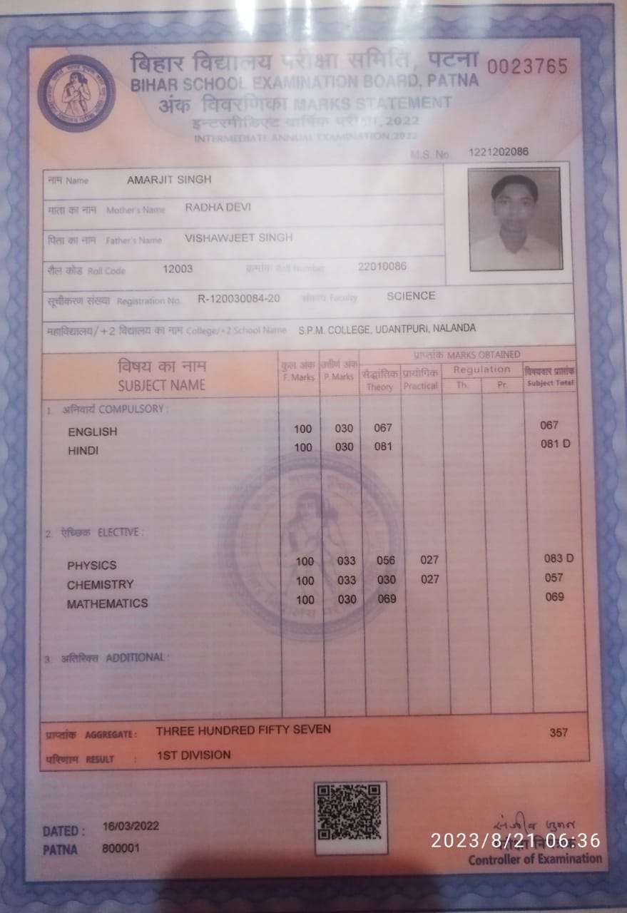 | Exam | Full Marks | Pass Marks | Marks Obtained |