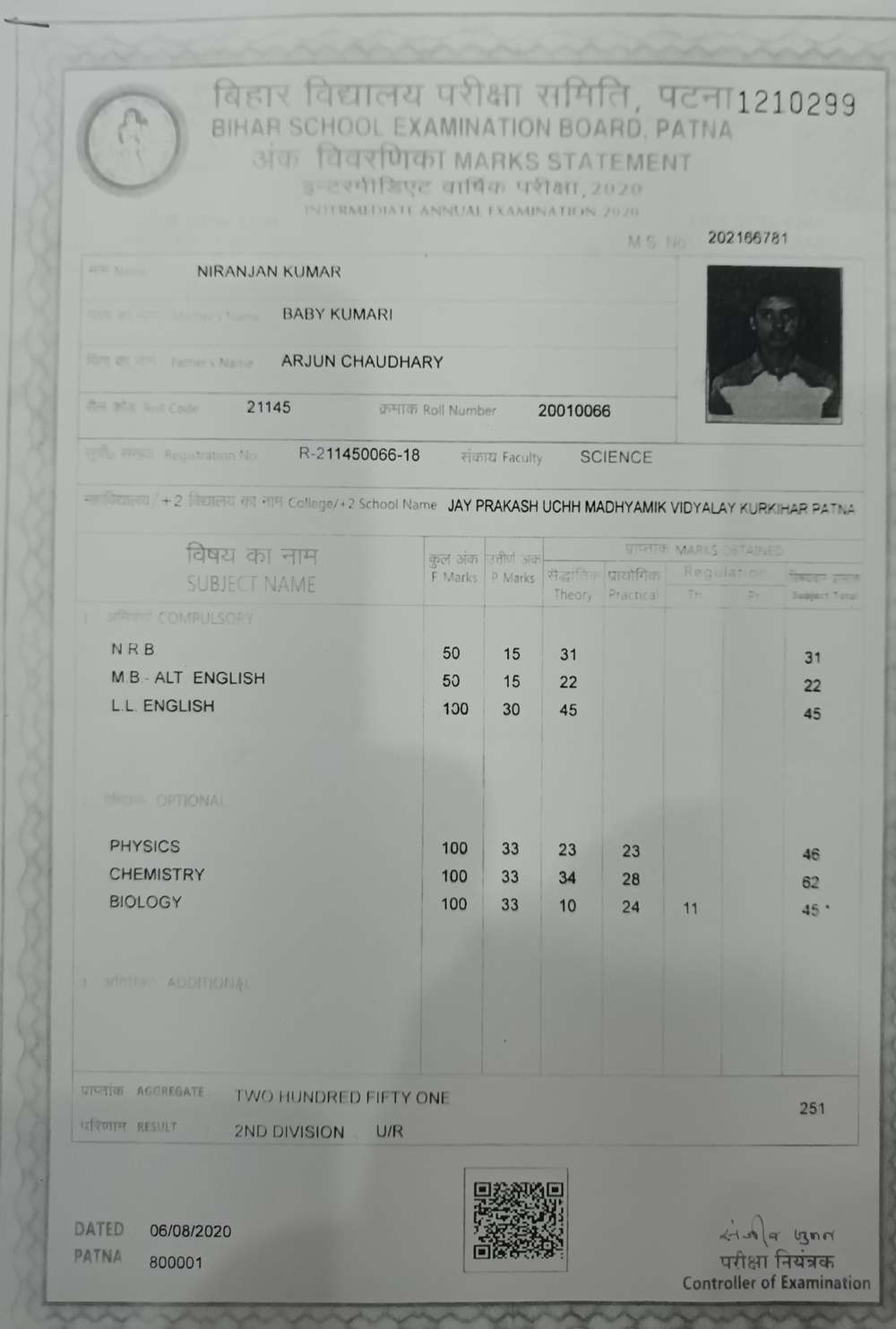 | Exam | Full Marks | Pass Marks | Marks Obtained |