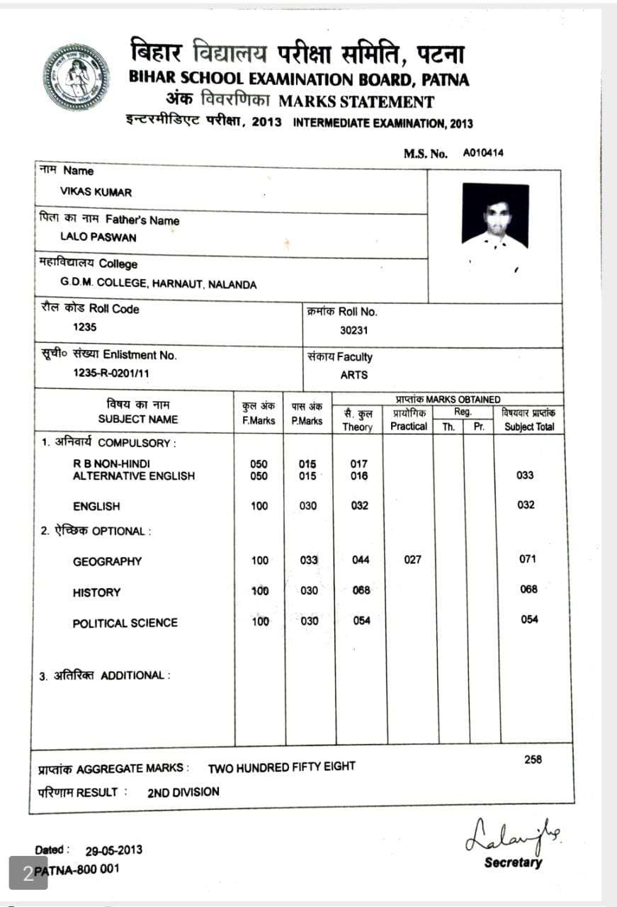 | Exam | Full Marks | Pass Marks | Marks Obtained |