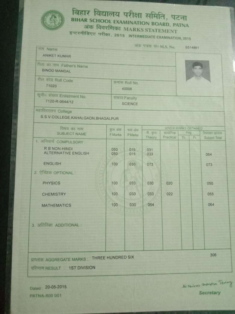 | Exam | Full Marks | Pass Marks | Marks Obtained |
