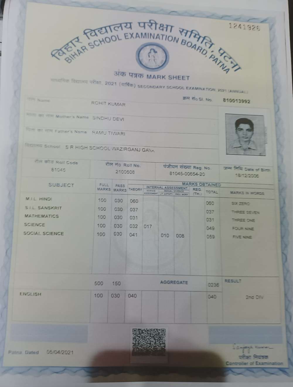 | Exam | Full Marks | Pass Marks | Marks Obtained |