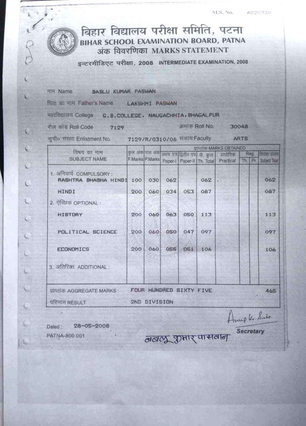 | Exam | Full Marks | Pass Marks | Marks Obtained |