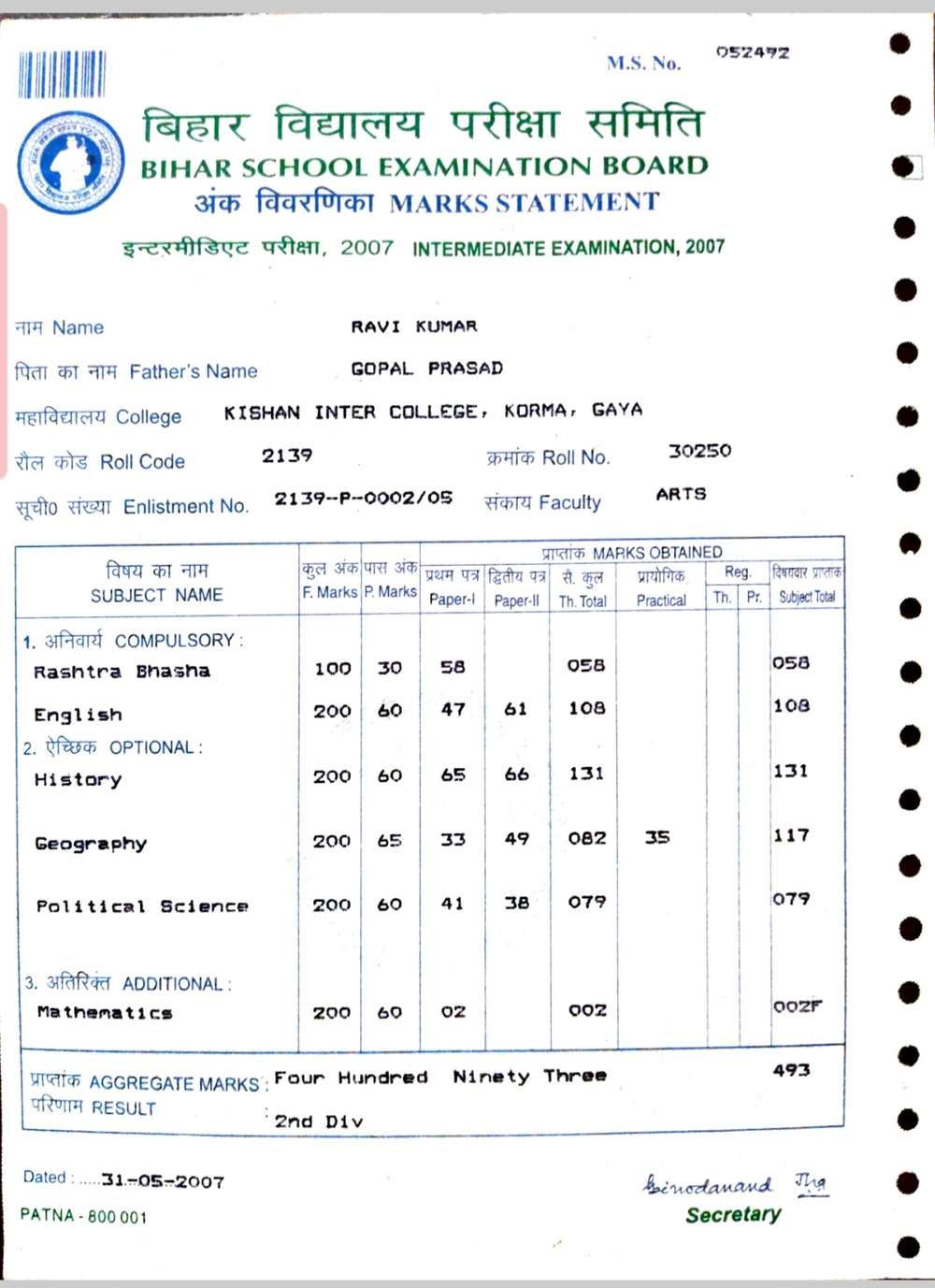 | Exam | Full Marks | Pass Marks | Marks Obtained |