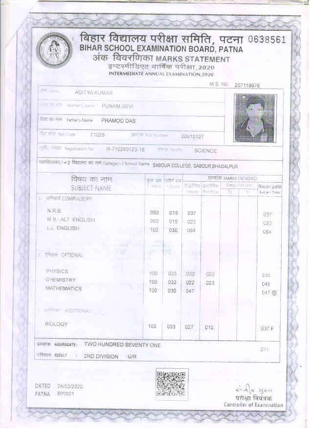 | Exam | Full Marks | Pass Marks | Marks Obtained |